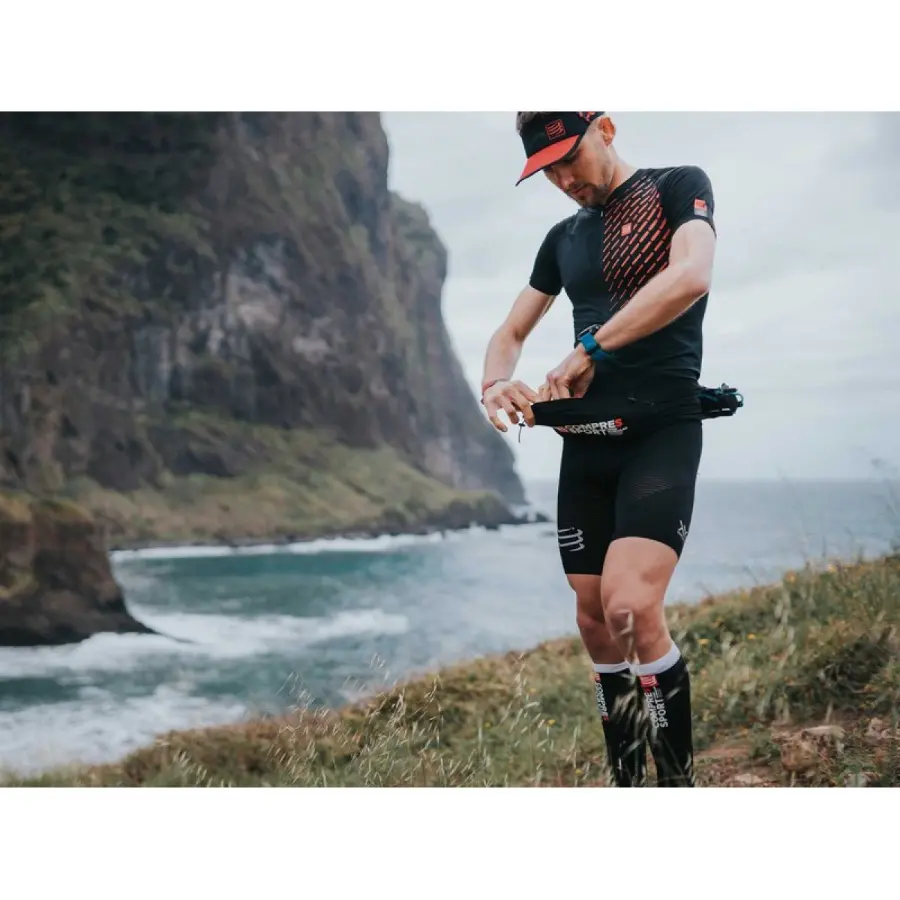 Běžecký pás Compressport Free Belt PRO byl vyvinut ve spolupráci s elitními běžci pro běžce jakékoliv výkonnosti. Jedná se o jednu velkou kapsu, do které se vejde veškeré potřebné vybavení, výživa, tekutiny nebo osobní věci, a to vše díky perfektní elastičnosti bez jakéhokoliv poskakování věcí uvnitř pásu. Pojme několik ergoflasků, telefon, termoprádlo, nepromokavou bundu a spoustu dalšího. V zadní části se nacházejí dvě silikonem potažená gumová oka, které trailoví běžci využijí například pro skládací hole, nebo větší bundu či mikinu. Naproti tomu v přední části, jsou již integrované gumičky se zarážedly pro upevnění startovního čísla.